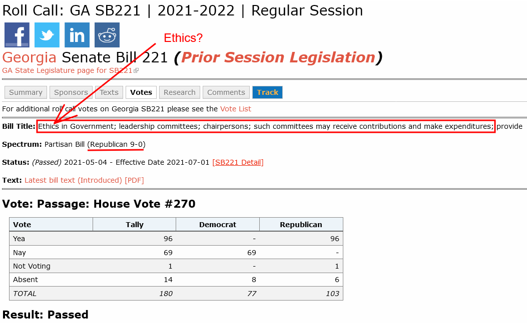 And so now, since SB221 passed in 2021, signed into law practically under the cover of darkness by Brian Kemp, isn't it wonderful that an oligarchical few, bellies to the bar alongside the wealthiest business entities, can now invest unlimited funds into the campaign coffers of state-wide government executives or hopefuls, and in return receive their own personal list of cellphone numbers to call whenever they desire special consideration, or legislation to accrue to their financial benefit? That is the Georgia Republican Party Brian Kemp is forming. That is what legalized corruption looks like.