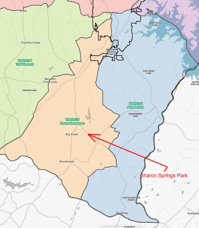Sharon Springs Park is located in the southernmost portion of Forsyth County, approximately centered within the areas incorporating Districts 2 and 5, most convenient to constituents represented on the commission by Laura Semanson and Alfred John.