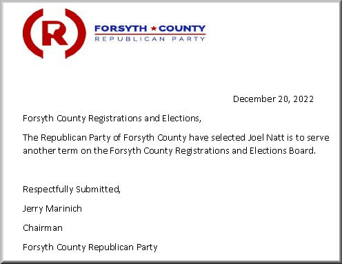 “Say what you want,” recently wrote one former Forsyth County Republican Party Chairman, “but the way the [Natt] appointment was made is the way it has been done as long as I have been involved with the Forsyth County Republican Party.” Informed that those appointments were not lawful, when asked to specify the nominations he made without party approval to the board of commissioners during his tenure, becoming indignant, the former GOP chair proudly doubling down, “I never did anything without the authority of the EC (Executive Committee) or CC (County Committee), as the case may have warranted. I do not recall a "vote" being taken but rather the EC (Executive Committee) had the opportunity to object. I considered it an approval by acclamation as is permitted.”