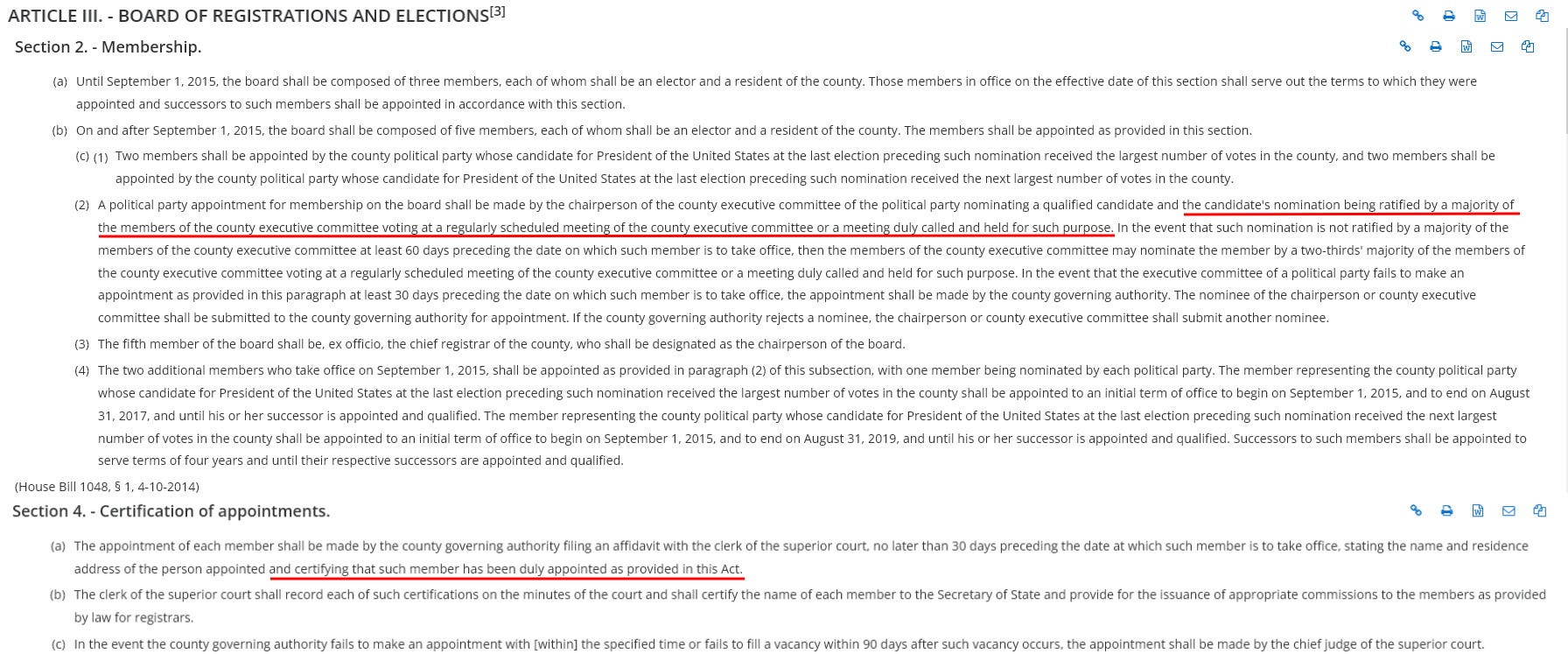 I ask that question because, as it turns out, the Forsyth County Republican Party Executive Committee (“chief executive committee” as described in OCGA 21-2-113), comprised of, at maximum, six members, IS NOT the committee at all empowered by law to vote on the ratification of a BRE nominee. Instead, according to OCGA 21-2-113 it is the entire “county executive committee,” which by that statute is the county committee at-large, normally numbering around 35 members, who must ratify a BRE nominee by majority vote before he or she could be tendered for appointment by the board of commissioners. Not coincidentally, it was the official Forsyth County Republican Party Parliamentarian, Joel Natt, who therefore bore a responsibility to know the law regarding appointments, but who reportedly steered the party “chief executive committee,” including the former chairman, to believe his nomination was controlled by one individual, the same now former chairman who purportedly wrote the letter above. That makes approximately 35 individuals who, as of today, because of county commission negligence, and/or affirmative disregard, were apparently systematically denied the lawful right to vote on Mr. Natt’s nomination before the commission rubber-stamped the appointment on February 2, 2023, having received not even a signed application for that appointment. It’s astounding that the Forsyth County Commission would freely hand out powerful board positions in county government without even requiring an application, or even a signed letter or affidavit of qualification.
