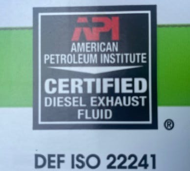 The manufacturer of this diesel exhaust fluid CERTIFIES that its product COMPLIES WITH THE ISO 22241 STANDARD. As Black’s Law Dictionary tells us, to CERTIFY means “to authoritatively confirm as being genuine or true as represented, or comply or meet specified requirements or standards.” Thus, if the fluid from a manufacturer’s container, leaving the factory bearing this label, is a substance OTHER THAN diesel exhaust fluid ISO 22241, the exhaust system of any engine in which it is used could suffer heavy damage. That means the exhaust fluid manufacturer found negligent, having falsely or mistakenly CERTIFIED that the fluid in the container is what the label says it is, could be held liable to pay for those damages. You with me? Because it is CERTIFIED ISO 22241, that certification creates a legal foundation for diesel engine operators or other interested parties to depend that the fluid behind the label is sufficient to its stated purpose and safe to use in diesel engines.