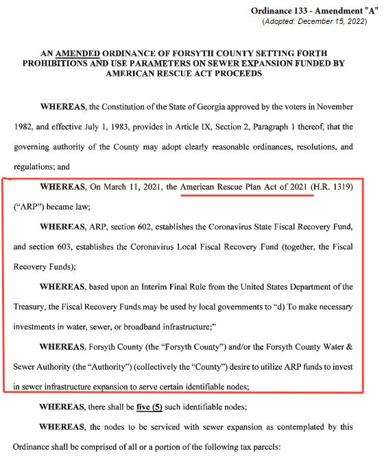 Below you will find page 1 of 20 of that ordinance, paragraphs two through five citing the the authority and desire to use ARPA funds for the sewer lines along the nodes Mr. Jarrard referenced during the October 2021 meeting. And you will also see below, the signatures of both commissioners, Semanson and John, emblazoned on the ordinance document Mr. Jarrard proposed fourteen months earlier.