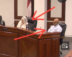 In the screenshot below, identified with red arrows, you can see Forsyth County’s present commission chairman, Alfred John, and Commissioner Semanson listening to county attorney Jarrard explain that the aforementioned federal ARPA funds could indeed be used for sewer construction. Mr. Jarrard then described how in his opinion the use of sewer lines built with ARPA funds should be appropriately secured by a county ordinance.