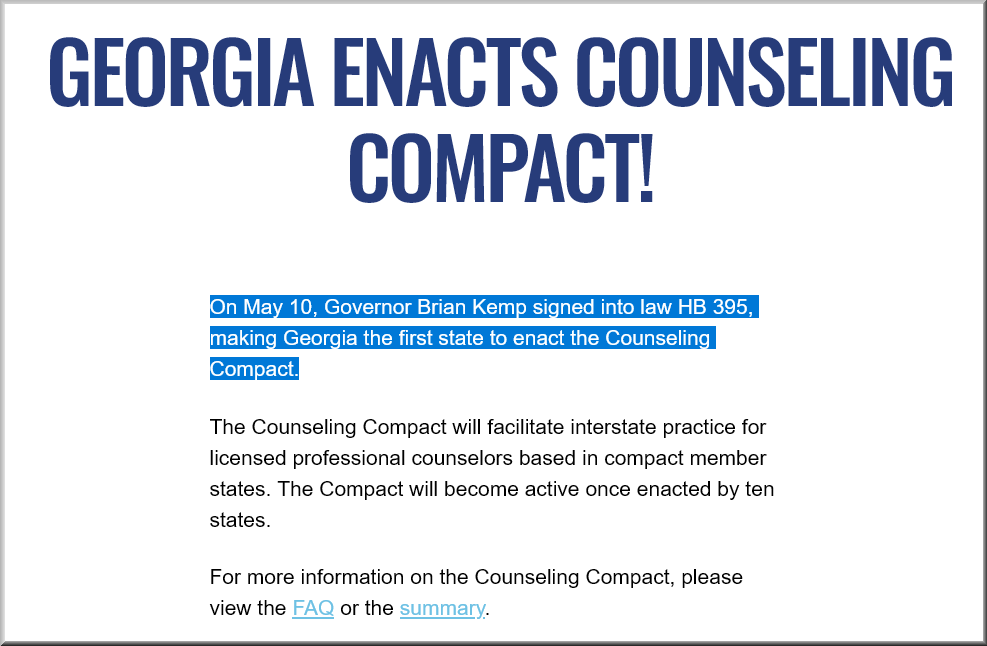 As the Georgia Record reported, in 2021 Kemp appointed Herrin to the Georgia Composite Board of Professional Counselors, Social Workers, and Marriage and Family Counselors. Parenthetically, doesn’t it seem a little outside the role of government to establish a Board of Professional Counselors? Well, I dunno. I mean, what do counselors do? Obviously, they counsel. So, who do they counsel? There you go. Now you are asking the right question. Licensed Professional Counselors (LPC’s) are “master's-degreed mental health service providers, trained to work with individuals, families, and groups in treating mental, behavioral, and emotional problems and disorders.” During the 2021 General Assembly, HB395 passed into law, making Georgia the very first state in the nation to sign on to the Interstate Counseling Compact, now duly-established among over half of the 50 states.