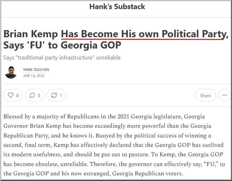 In my April 16 Substack, "Brian Kemp Has Become His own Political Party, Says 'FU' to Georgia GOP,” you will recall the Governor’s statement to a gathering of his recently-formed Georgia First Leadership Committee, informing the cadre of elite political contributors, “We can no longer rely on the traditional party infrastructure to win in the future.” I continued,