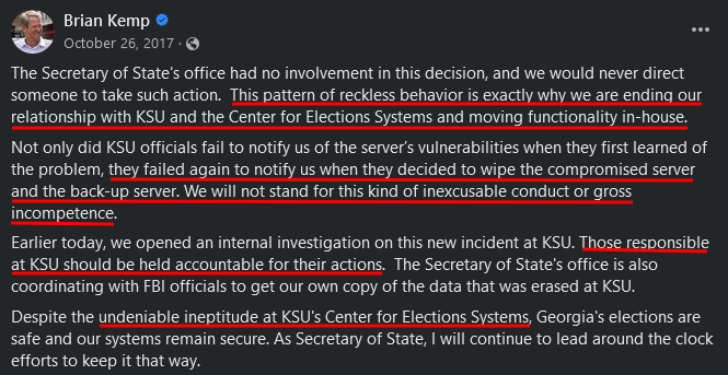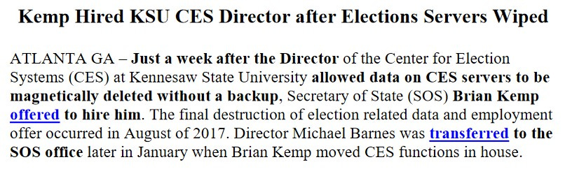 Just before making the change to bring the election operations under the full control of the Secretary of State, Kemp expressed outrage regarding alledged potential vulnerabilities at the KSU Center for Elections Center (CES), especially the wiping of data from the system, posting on Facebook,