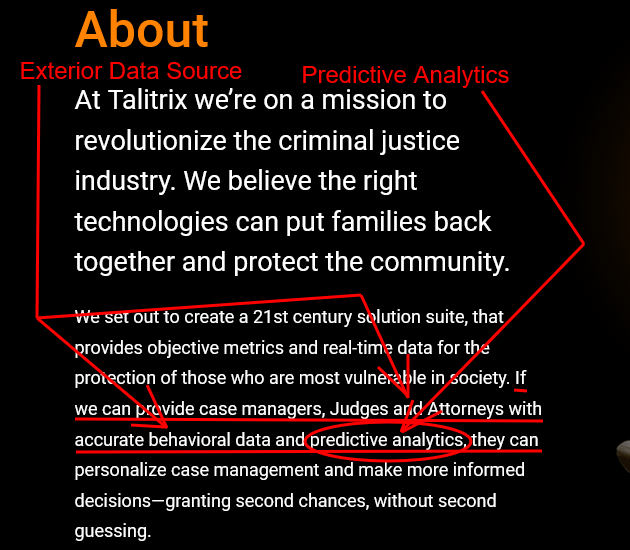 Consistent with the statements of Representative Jones to the Tennessee Senators, the Talitrix website also provides concrete evidence that lines 762-764 in HB520 refer directly to the patented Talitrix system. According to the website, “If we can provide case managers, Judges and Attorneys with accurate behavioral data (here the website describes Talitrix as an “exterior data source” as specified in HB520) and predictive analytics (Talitrix, rather than GDAC would provide of the predictive analytics as HB520 requires), they can personalize case management and make more informed decisions—granting second chances, without second guessing.” Thus, the Talitrix website is in full agreement with Todd Jones’ representations to the Tennessee legislative subcommittee and the requirements written into HB520, which Jones Sponsored.