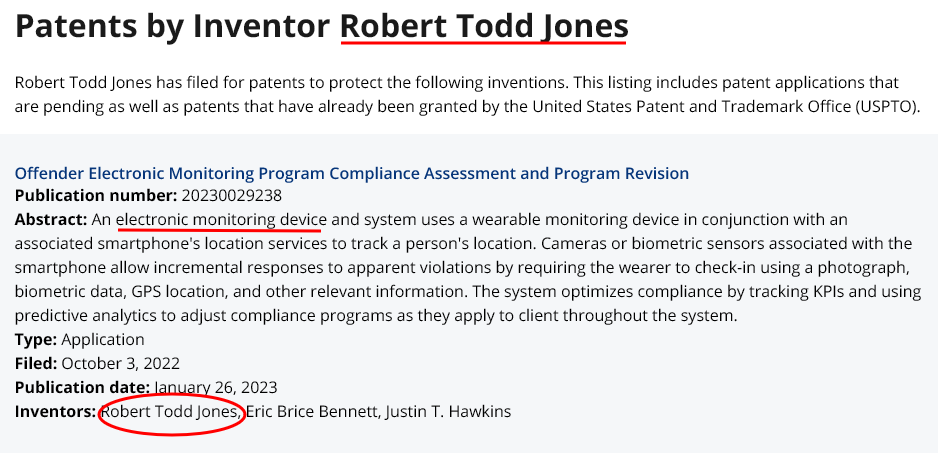 Speaking to the Tennessee Joint Subcommittee on Bail Reform, in the video Representative Jones advises the senators, “One of the things we realized was that there was not enough, ‘business analytics.’” Jones continues, “For those of you in business today, you hear all the time, ‘business analytics, predictive analytics.’” Representative Jones relates those terms to the Tennessee legislators because the Talitrix system is designed to use its proprietary artificial intelligence to provide “predictive analytics” using the data it collects. That fact can be found in the description of Representative Jones’ patent. According to the patent, the Talitrix watch is an “electronic monitoring device.” The patent says the monitoring device “tracks a person’s location.” It “optimizes compliance by tracking key performance indicators and uses “predictive analytics” to adjust compliance programs as they apply to client throughout the system.”