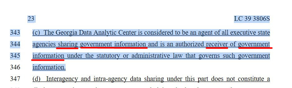 We see on those lines that under HB520 the Georgia Department of Behavioral Health and Developmental Disabilities would “establish a grant program with funding and ‘technical assistance’ for one or more counties to create or expand ‘collaborative’ jail in-reach and reentry programs.” That “technical assistance” means Talitrix assistance. It must mean Talitrix because, as Representative Gravely told us, no other firm can provide the patented technology, equipment, and services Talitrix has, and which HB520 requires. Furthermore, the programs established under HB520, (ie. jail in-reach, addictive services, mental health services) are “collaborative” because together each requires a collaborative database among several jurisdictions, local all the way up to the entire State of Georgia. As we have seen, under HB520 the “collaborative database” for the entire State of Georgia would be created and maintained by GDAC. To that purpose, late in the afternoon of the final day of the 2023 Georgia General Assembly, the HB520 provisions authorizing GDAC to use and share data obtained from “external data sources” as shown in the following graphic, were copied and pasted into SB23, and quickly passed by both chambers.
