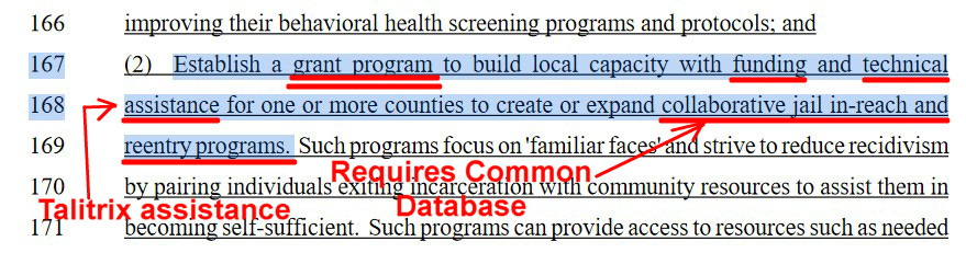 Next, let us look at one source of taxpayer funding for Talitrix technology and services in HB520. Without funding, none of this could happen. Let’s go to lines 167-170, where HB520 refers to “Jail in-reach and re-entry programs.”