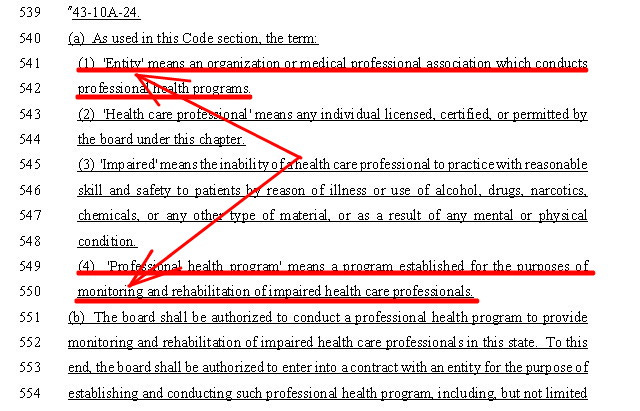 On lines 541 and 542 below, an ‘entity’ is defined as, “an organization or medical professional association which conducts professional health programs.” On lines 549 and 550, a “professional health program” is defined as, “a program established for the purposes of monitoring and rehabilitation of impaired health care professionals.” Thus, although encrypted in layers of confusing language, by virtue of what we already know, the term, “entity,” in this instance can only mean the monitoring company in question, Talitrix.