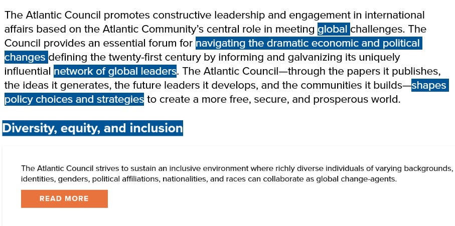 The Atlantic Council’s primary purpose is to generate ideas to meet challenges to globalism, and to foster “dramatic economic and political change” by informing and “galvanizing” globalist leaders to shape policy choices and strategies to accomplish its worldwide purposes. By “dramatic economic and political change,” the Atlantic Council means, “regime-change.” Furthermore, the Atlantic Council promotes Diversity, Equity and Inclusion philosophy throughout its sphere of influence. In the photo below, the globalist influence over the purposes of the Atlantic Council is on display.