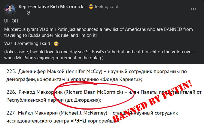Georgia’s 6th District Representative, Rich McCormick, is “feeling cool” being included in Vladimir Putin’s list of 500 individuals forbidden to enter Russia. The original list comprising almost 1000 individuals was published a year ago. Below we see McCormick crowing with excitement on social media about his inclusion.