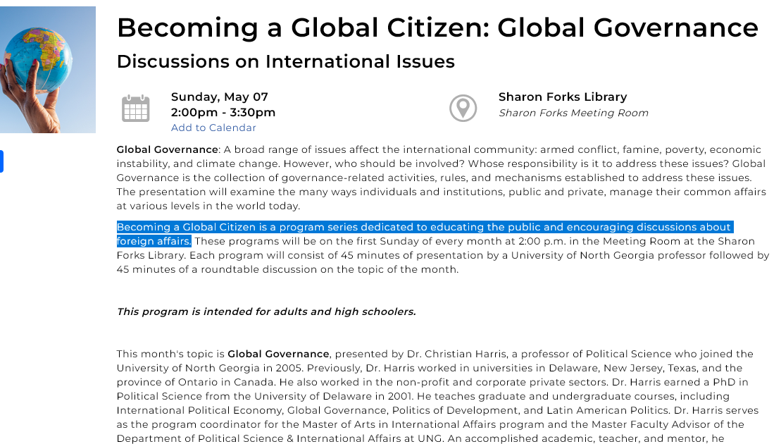 Recently, two knowledgeable friends and I darkened the door of a free discussion on international issues at one of our local libraries (I should have stayed home and watched the Braves). The program was the first of an ongoing series by a University of North Georgia professor of Political Science, Dr. Cristian Harris.